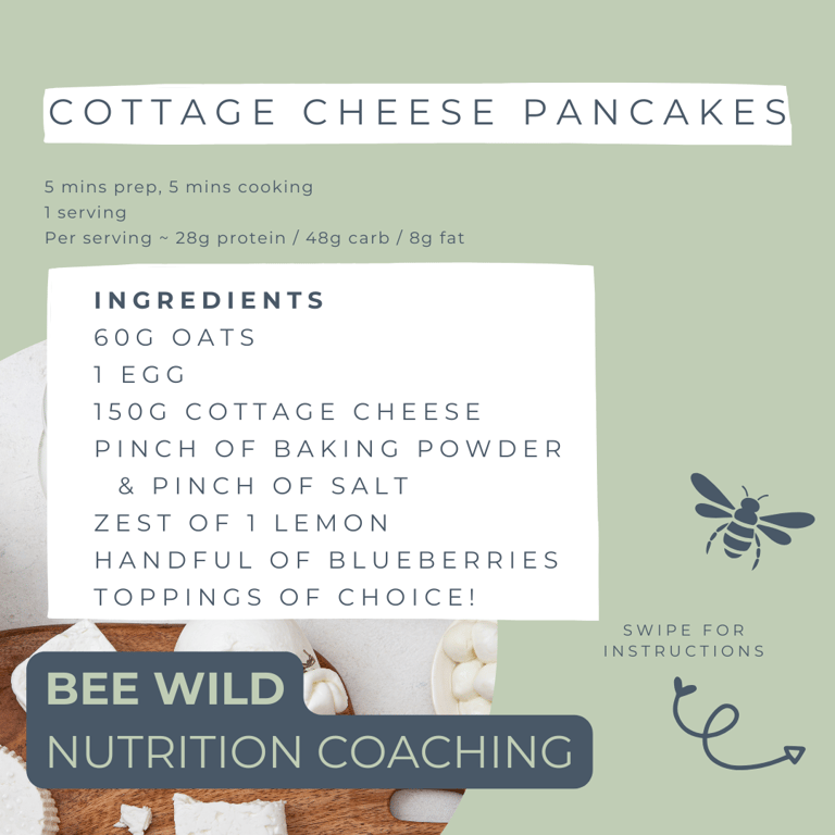 These cottage cheese pancakes make a great breakfast option, topped with blueberries, Skyr or Greek yoghurt. For a savory twist, replace the lemon zest with chives and add mushrooms and a fried egg on top.